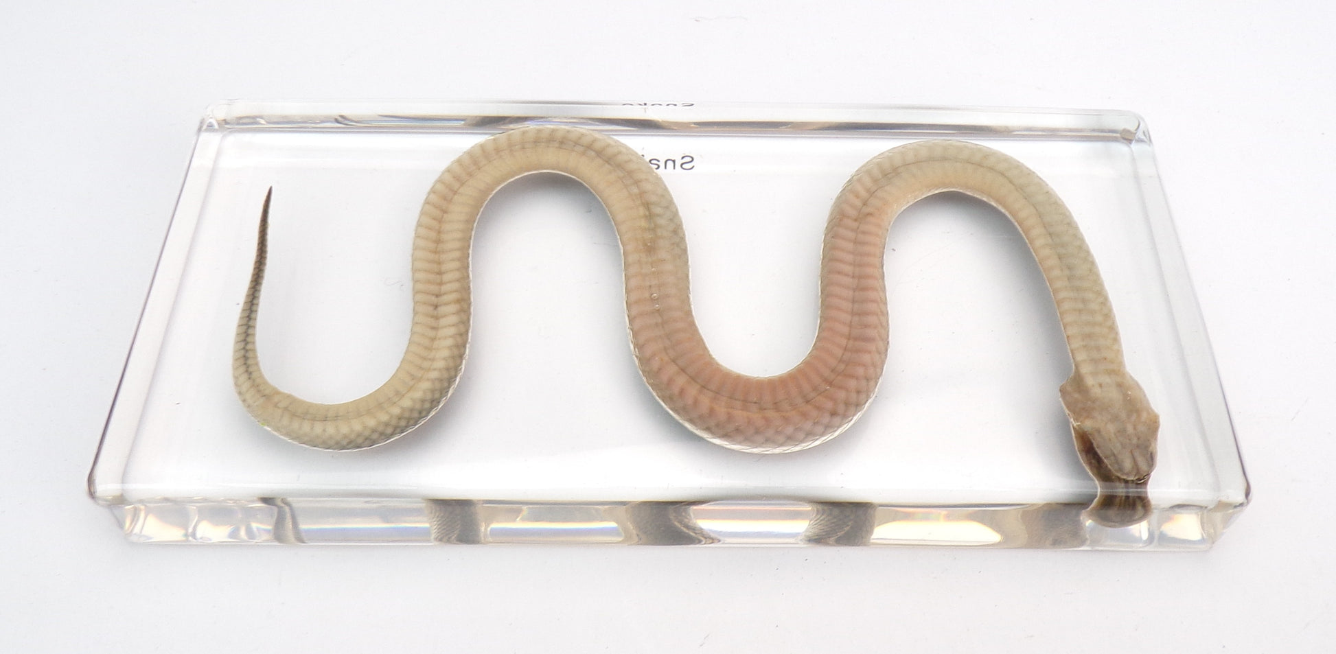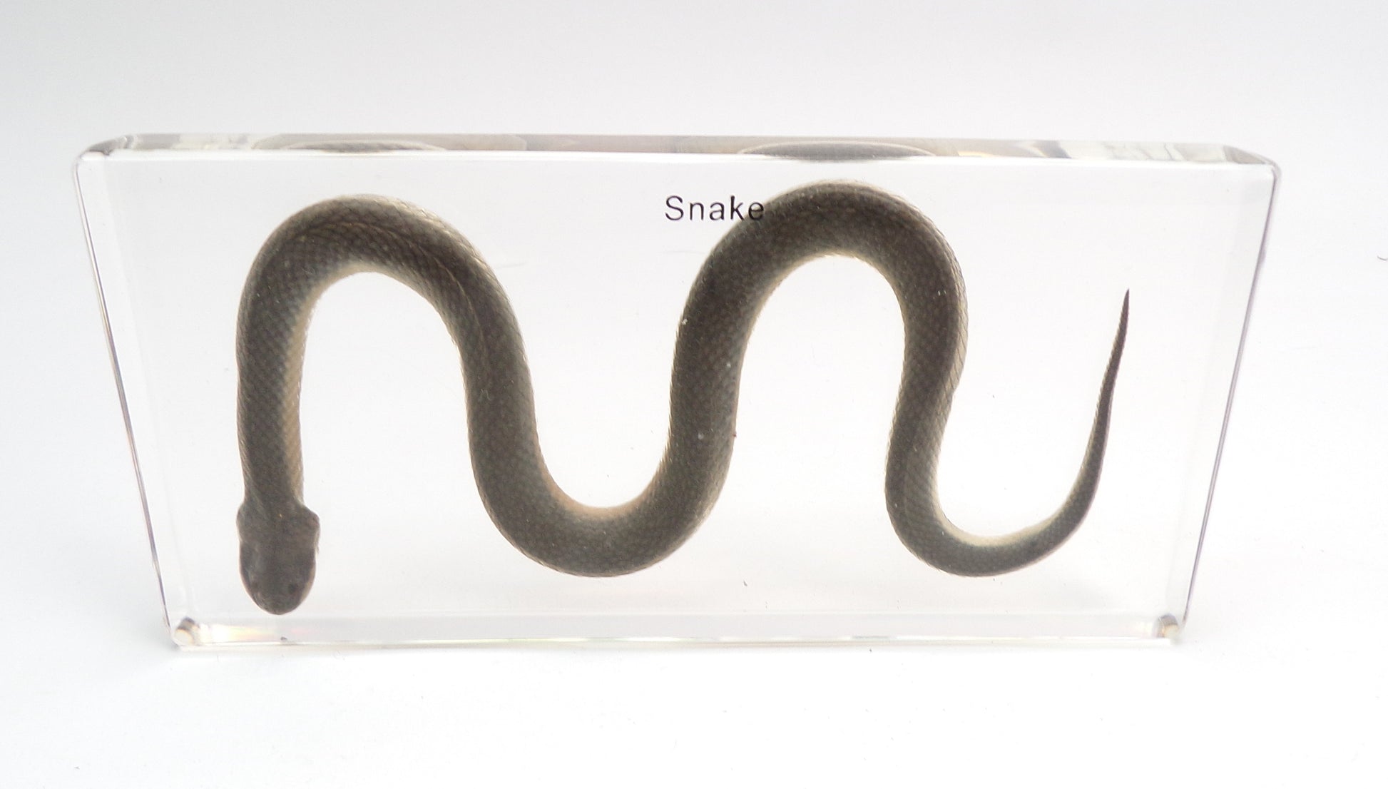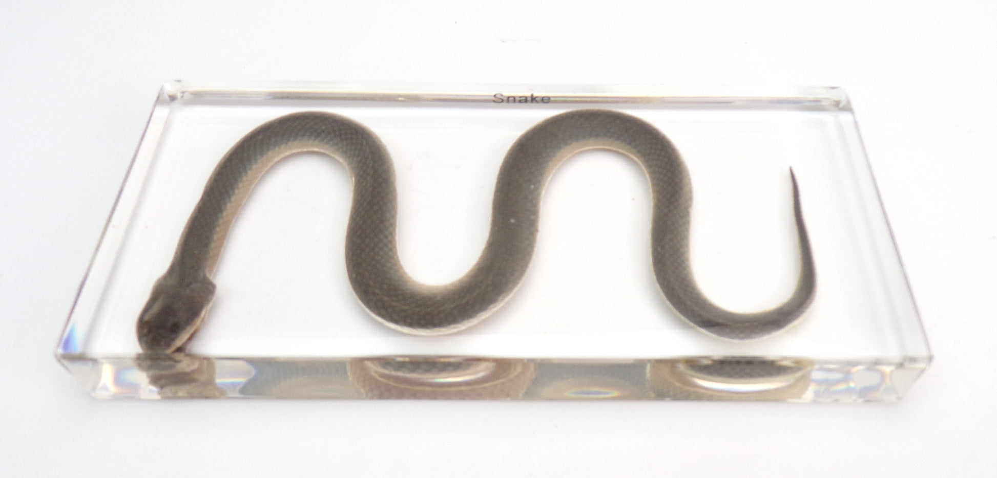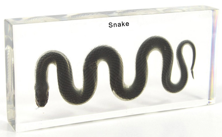 A real snake cast in epoxy. This will be shipped in a white box and wrapped in protective foil.