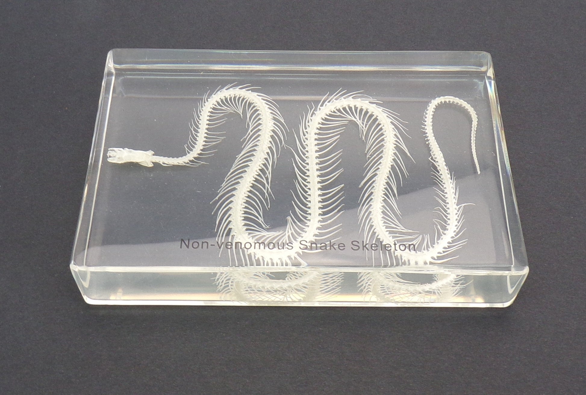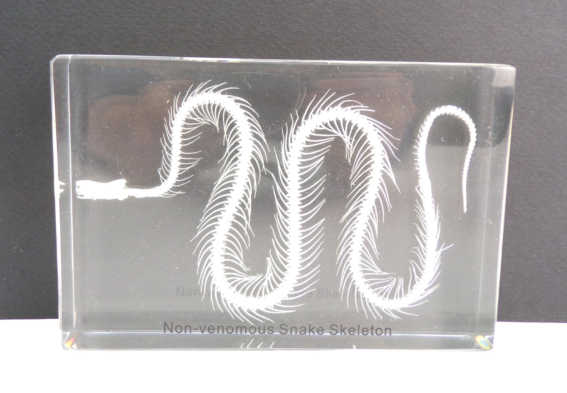Un scheletro di serpente immerso nell'epossido. Questo verrà spedito in una scatola bianca e confezionato in pellicola protettiva.