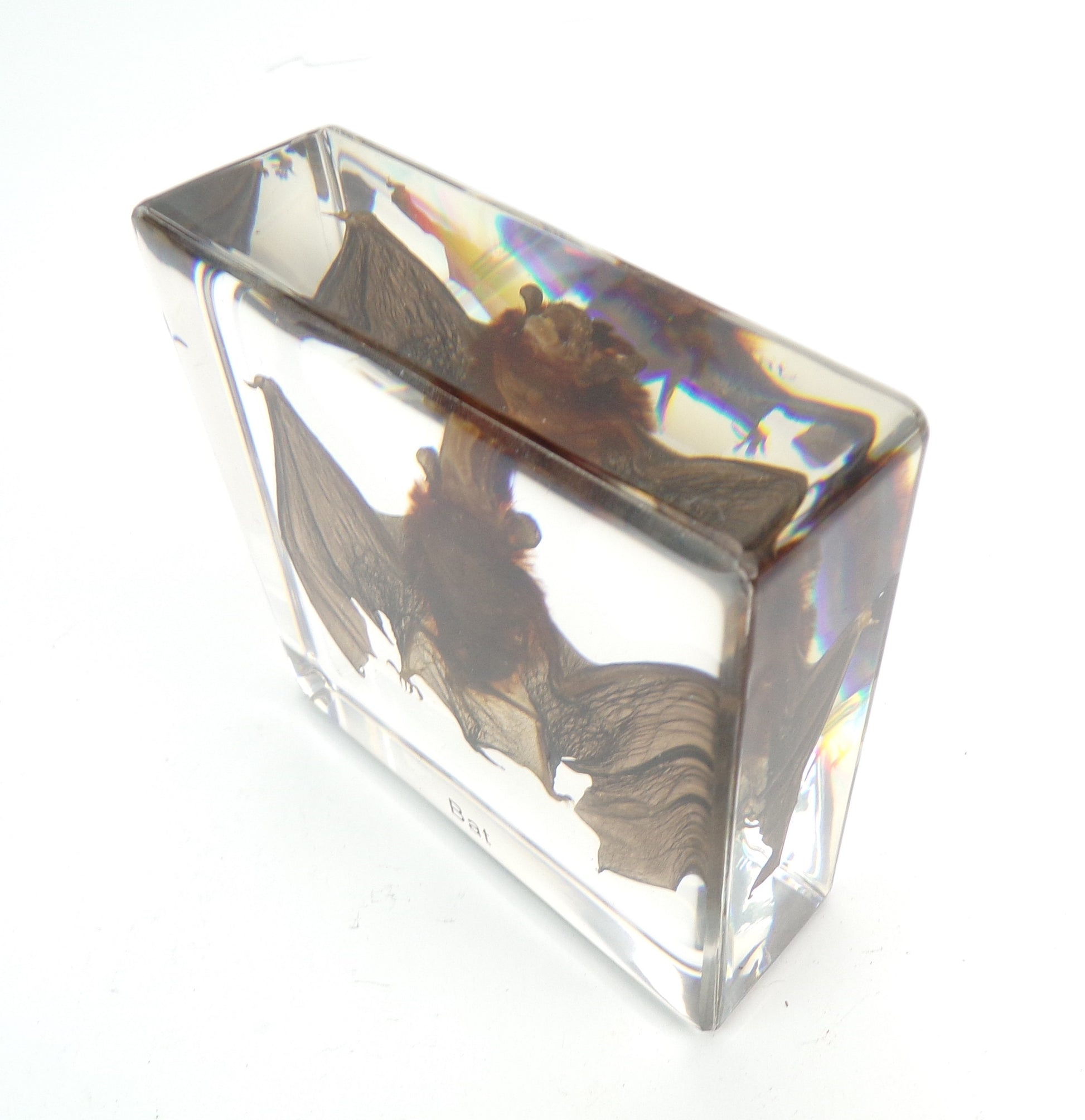 A real bat cast in epoxy. This will be shipped in a white box and wrapped in protective foil.