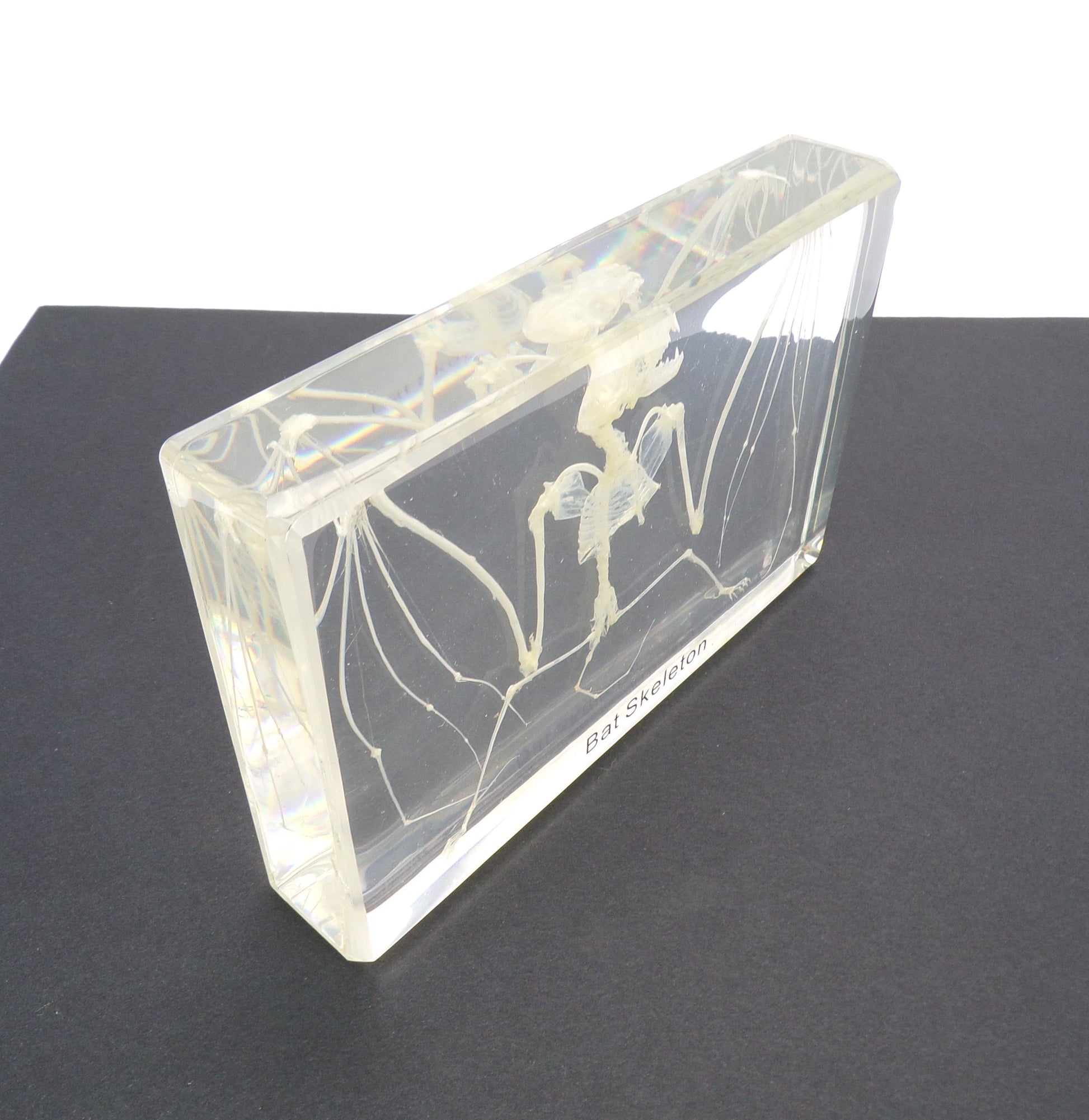Un vero scheletro di pipistrello immerso nell'epossido. Questo verrà spedito in una scatola bianca e confezionato in pellicola protettiva.