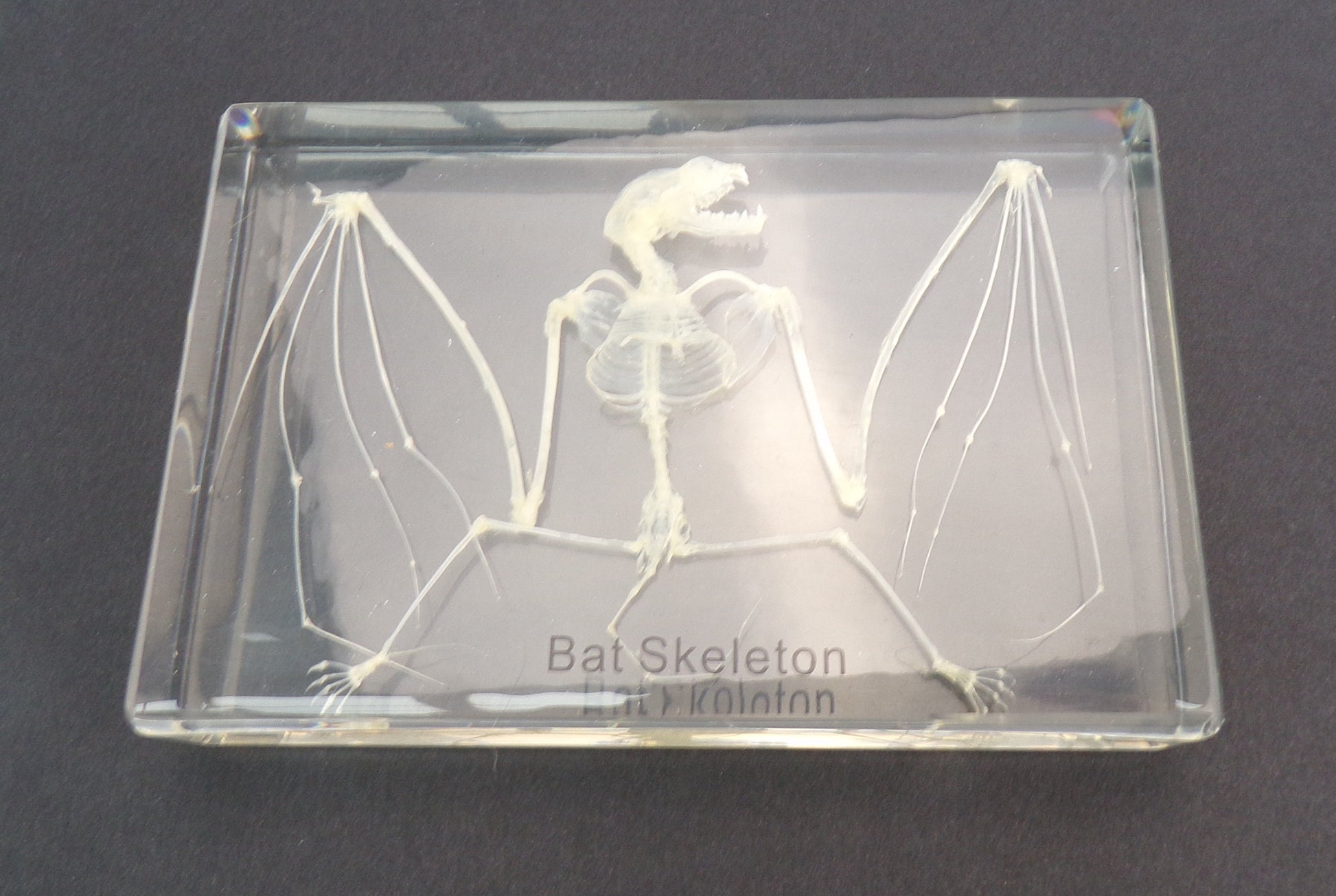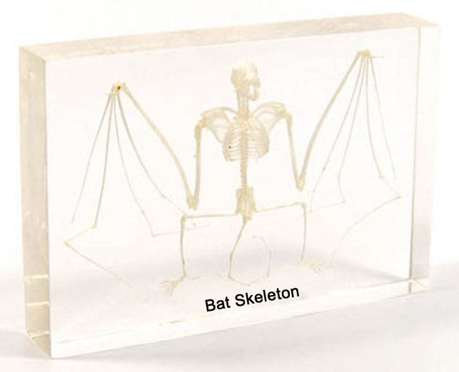A real bat skeleton cast in epoxy. This will be shipped in a white box and wrapped in protective foil.